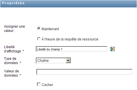 Spécifiez un libellé d'affichage pour le champ, ainsi que le type de données et la valeur. Les types de données suivants sont pris en charge :