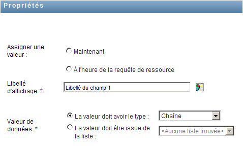 Spécifiez un libellé d'affichage pour le champ et indiquez si la valeur doit être d'un type de données particulier ou si elle doit venir d'une liste.