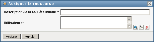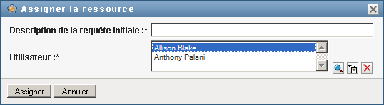 Les champs et sont obligatoires et figurent sur tous les formulaires de requête de ressource. Afin de sélectionner les utilisateurs pour une assignation de ressource, vous pouvez utiliser le sélecteur d'objet.