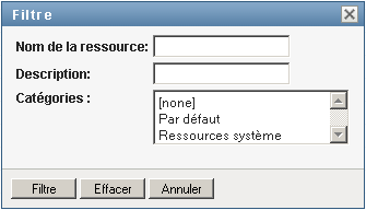 Dans la boîte de dialogue , spécifiez une chaîne de filtre pour le nom ou la description de la ressource, ou sélectionnez une ou plusieurs catégories dont vous souhaitez afficher les ressources. Cliquez sur :