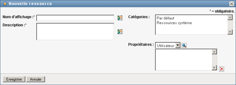 L'application utilisateur affiche la boîte de dialogue Nouvelle ressource :