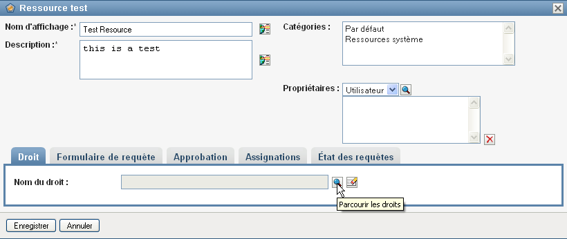REMARQUE :si vous n'avez pas configuré la ressource DirXML correctement, lorsque vous accédez à la page afin de sélectionner un droit, un message vous indique que vous n'avez pas configuré vos droits pour l'assignation de ressource.