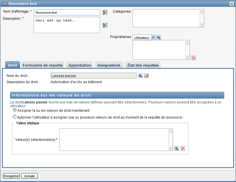 Droit qui accepte une ou plusieurs valeurs de paramètre. Par exemple, une ressource peut être associée à un droit nommé « Laissez-passer » qui permet au demandeur de sélectionner un ou plusieurs bâtiments. Les valeurs autorisées sont spécifiées par une liste de droits, qui peut inclure une liste statique de valeurs définies par un administrateur ou une liste dynamique de valeurs générées à partir d'une requête LDAP. Vous pouvez assigner une valeur au moment de la conception lorsque vous définissez la ressource, ou autoriser l'utilisateur à assigner une valeur au moment de la requête. Pour plus d'informations, reportez-vous à la section Liaison à un droit à valeurs multiples. |