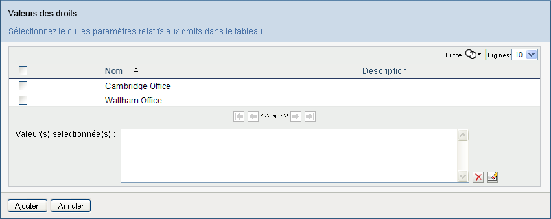 Sélectionnez une ou plusieurs valeurs à partir de la liste de droits par défaut :