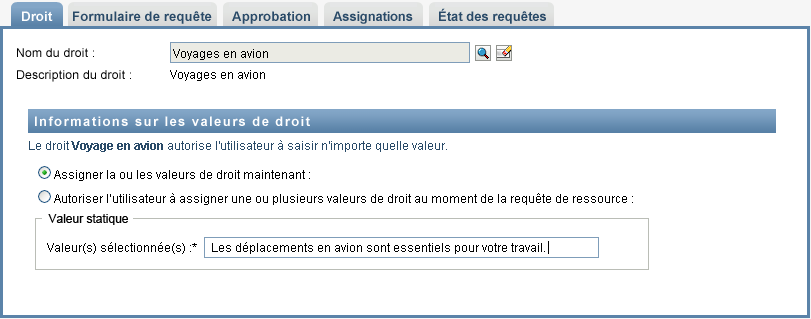Droit qui nécessite une valeur de paramètre unique. Par exemple, une ressource peut être associée à un droit nommé « Autorisation parking » qui permet au demandeur de sélectionner un emplacement de parking. Les valeurs autorisées sont spécifiées par une liste de droits, qui peut inclure une liste statique de valeurs définies par un administrateur ou une liste dynamique de valeurs générées à partir d'une requête LDAP. Vous pouvez assigner une valeur au moment de la conception lorsque vous définissez la ressource, ou autoriser l'utilisateur à assigner une valeur au moment de la requête. Pour plus d'informations, reportez-vous à la section Liaison à un droit à valeur unique. |