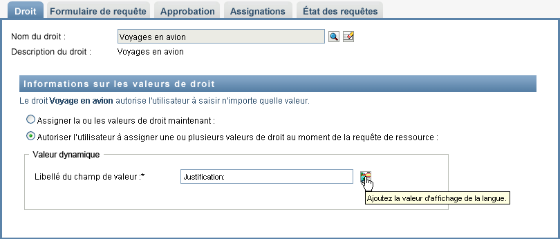 Droit qui nécessite une valeur de paramètre spécifiée comme une chaîne de format libre au moment de la requête. Par exemple, une ressource peut être associée à un droit nommé Vêtements qui permet au demandeur de spécifier une valeur représentant sa couleur préférée. Vous pouvez assigner une valeur au moment de la conception lorsque vous définissez la ressource, ou autoriser l'utilisateur à assigner une valeur au moment de la requête. Pour plus d'informations, reportez-vous à la section Liaison à un droit avec valeur de format libre. |