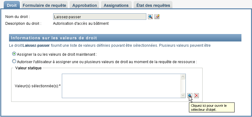 Utilisez le sélecteur d'objet pour choisir les valeurs de droit :
