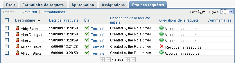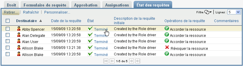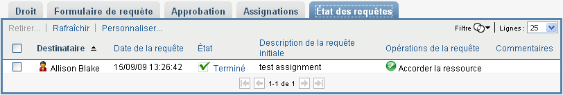 L'opération permet d'afficher l'état de vos requêtes d'assignation de ressource, y compris celles effectuées directement et celles concernant des ressources assignées par le biais de rôles. Elle permet d'afficher l'état actuel de chaque requête. Vous pouvez en outre retirer une requête qui n'est pas finalisée si vous avez changé d'avis et si vous ne souhaitez plus qu'elle se poursuive.