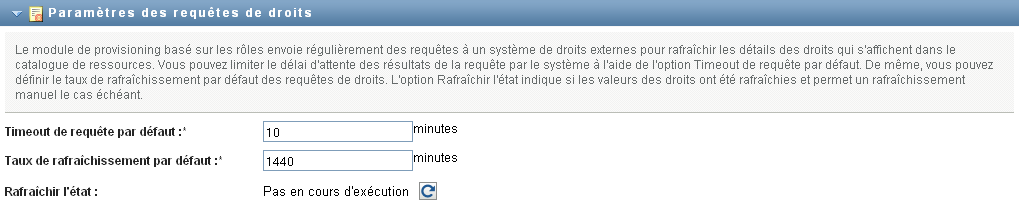 Ces paramètres contrôlent le comportement des requêtes de droits exécutées par l'application utilisateur. Vous pouvez définir un intervalle de timeout et un taux de rafraîchissement pour les requêtes de droits. En outre, vous pouvez voir si les valeurs des droits ont été rafraîchies et, le cas échéant, lancer un rafraîchissement manuel.