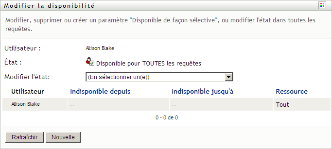L'application utilisateur affiche la page Modifier la disponibilité. Si vous n'avez aucun paramètre de disponibilité existant, la liste est vide :