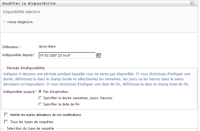 L'application utilisateur affiche un ensemble de contrôles destinés à préciser la période pendant laquelle vous n'êtes pas disponible et à sélectionner les requêtes auxquelles le paramètre s'applique.