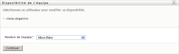 La liste des équipes inclut celles pour lesquelles les gestionnaires d'équipe sont autorisés à définir la disponibilité (spécifiée dans la définition de l'équipe), ainsi que celles pour lesquelles la possibilité de définir la disponibilité a été désactivée. Si la définition de l'équipe n'autorise pas les gestionnaires d'équipe à définir la disponibilité, le gestionnaire peut néanmoins afficher les paramètres de disponibilité définis pour les membres de l'équipe par l'administrateur ou par le gestionnaire d'une autre équipe auxquels sont associés ces utilisateurs. Cependant, le gestionnaire d'équipe ne peut ni modifier ni supprimer ces paramètres, en afficher les détails, ou créer de nouvelles assignations de disponibilité.