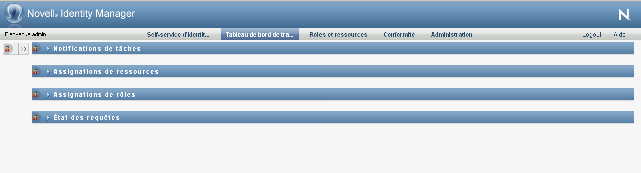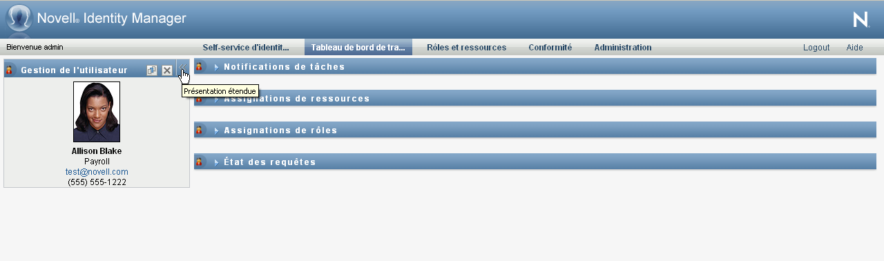 La section Profil utilisateur masque les détails de l'entité actuellement sélectionnée pour vous donner plus d'espace pour travailler avec les sections Notifications de tâches, Assignations de ressources, Assignations de rôles et État des requêtes de la page.