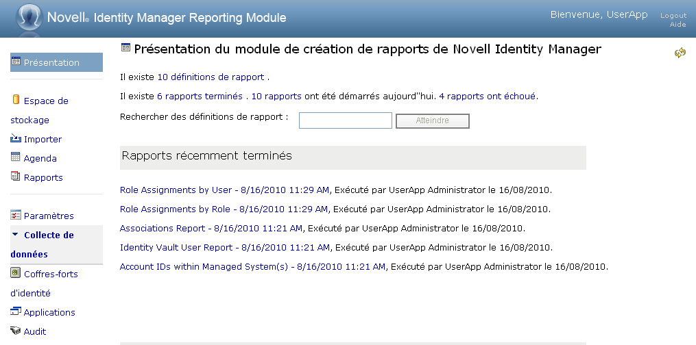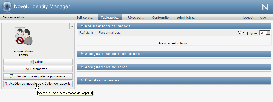 Pour accéder au module de création de rapports Identity depuis l'application utilisateur :