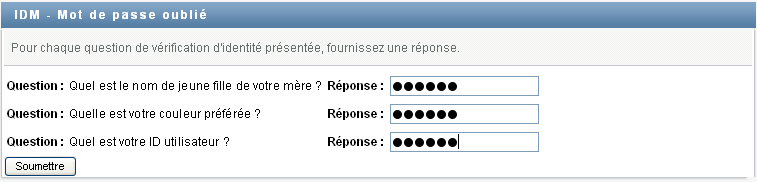 Répondez aux questions de vérification d'identité pour obtenir de l'aide à propos de votre mot de passe. En fonction du mode selon lequel l'administrateur système a configuré votre stratégie de mot de passe, vous pouvez :