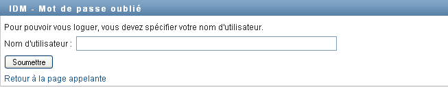 Si vous ne parvenez pas à vous loguer à l'application utilisateur Identity Manager, vérifiez que vous utilisez le nom d'utilisateur correct et que vous saisissez correctement le mot de passe (orthographe, respect des majuscules et des minuscules, etc.). Si le problème persiste, consultez votre administrateur système. Il peut être utile que vous fournissiez des détails concernant le problème que vous rencontrez (par exemple des messages d'erreur).
