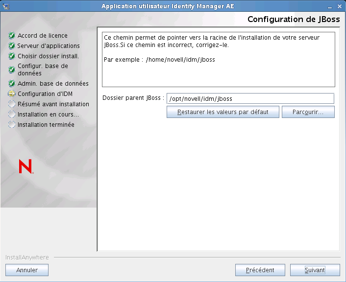 Indique à l'application utilisateur où le serveur d'applications JBoss se trouve. La procédure d'installation n'installe pas le serveur d'applications JBoss ; pour obtenir des instructions sur l'installation du serveur d'applications JBoss, reportez-vous à Installation du serveur d'applications JBoss et de la base de données PostgreSQL. : indiquez l'emplacement du serveur d'applications JBoss.