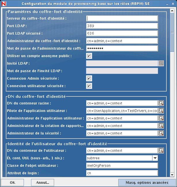 La vue par défaut du volet de configuration du module de provisioning basé sur les rôles contient les champs suivants :