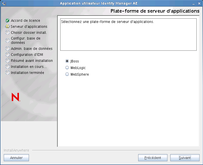 REMARQUE :pour JBoss 5.1.0, le programme d'installation requiert la version 1.6 du kit de développement de la plate-forme Java 2, Standard Edition (JRE ou JDK) de Sun. Si vous utilisez une autre version, la procédure d'installation ne configure pas correctement le fichier WAR de l'application utilisateur. L'installation semblera réussir, mais vous rencontrerez des erreurs lorsque vous tenterez de démarrer l'application utilisateur.