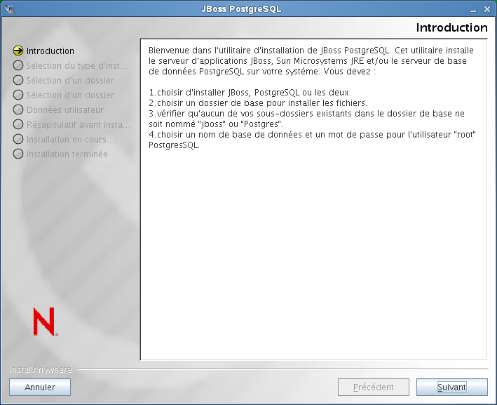 L'utilitaire JBossPostgreSQL installe le serveur d'applications JBoss et la base de données PostgreSQL sur votre système. Il ne prend pas en charge le mode console et requiert un environnement d'interface utilisateur graphique.