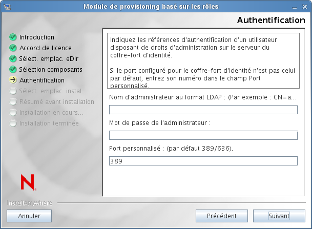 Indiquez le nom de l'administrateur au format LDAP et saisissez son mot de passe. Spécifiez également le port du serveur LDAP.