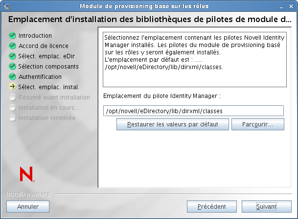 Si l'utilisateur dispose de références valides et de droits appropriés, le programme d'installation affiche l'écran Emplacement d'installation des bibliothèques de pilotes de module de provisioning basé sur les rôles :