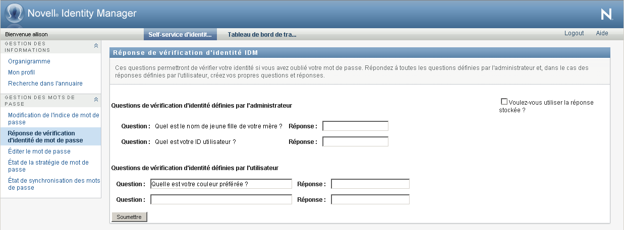 Saisissez une réponse appropriée dans chaque zone de texte (elles sont toutes obligatoires) ou utilisez votre réponse déjà enregistrée. Si l'option est sélectionnée, les réponses de vérification d'identité, y compris les libellés, ne sont pas affichées. En outre, les questions de vérification d'identité définies par l'utilisateur sont désactivées.