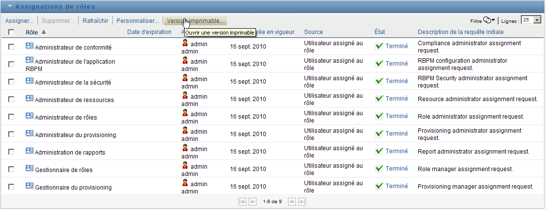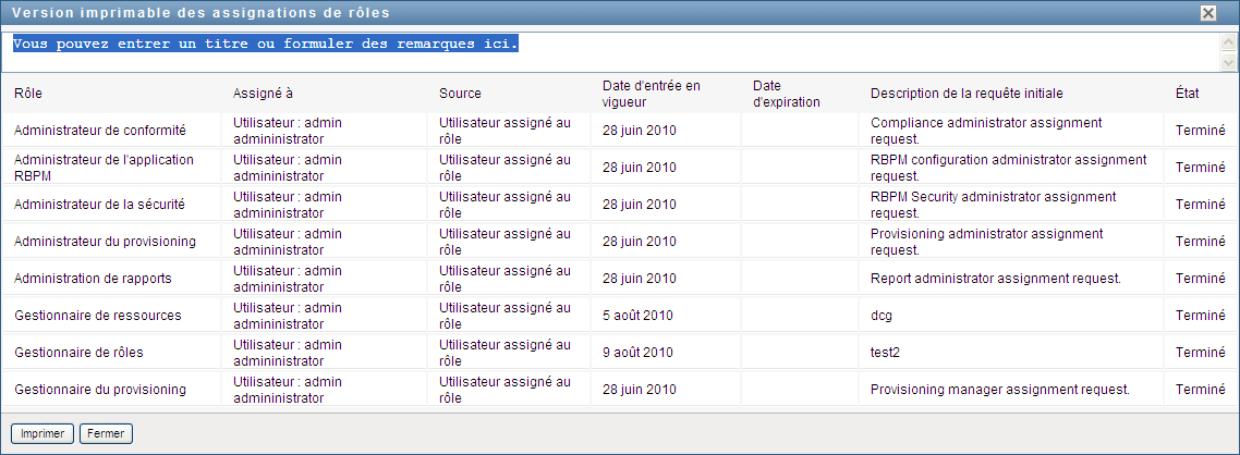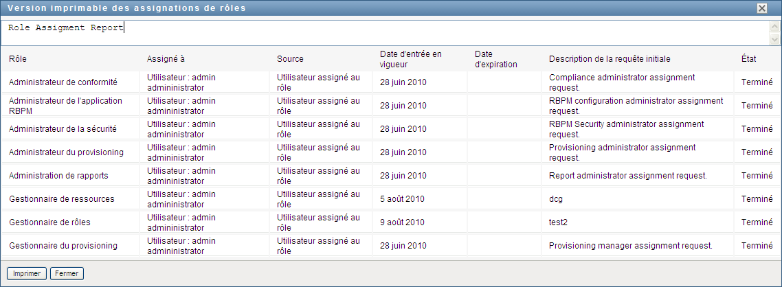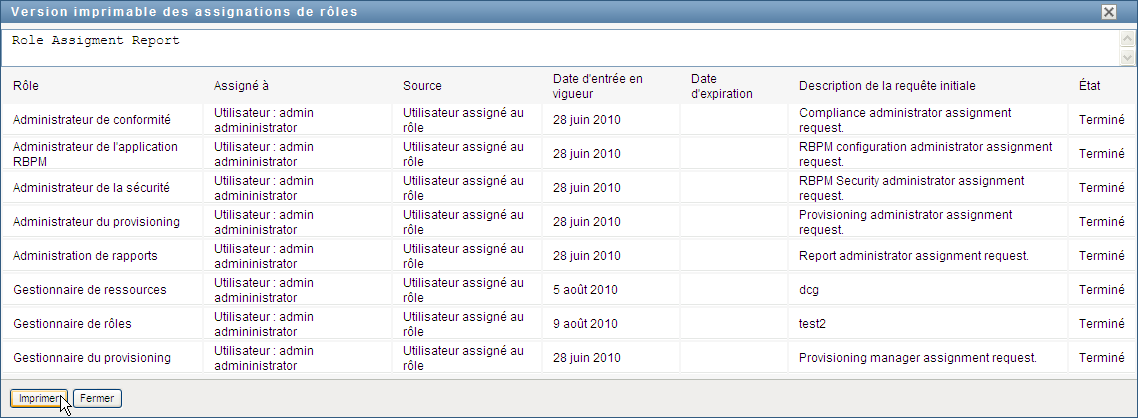 L'application utilisateur affiche, dans une fenêtre distincte, une version imprimable de la liste des assignations de rôles :