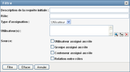 2. Spécifiez une chaîne de filtre pour la description de requête initiale ou pour le nom de rôle, ou affinez la recherche en sélectionnant un type d'assignation (Utilisateur, Groupe, Conteneur ou Rôle) et un ensemble d'identités correspondant au type d'assignation sélectionnée. Vous pouvez aussi affiner la recherche en sélectionnant un type de source pour l'assignation de rôle (Utilisateur assigné au rôle, Groupe assigné au rôle, Conteneur assigné au rôle ou Rôle associé à un rôle).
