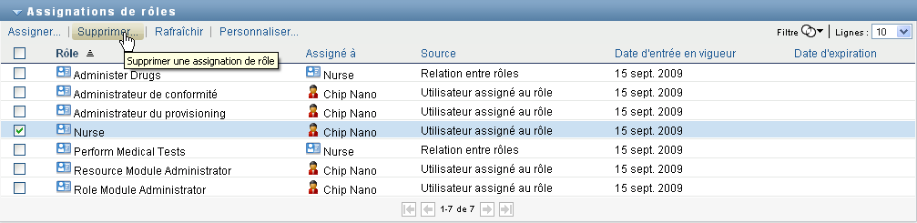 1. Sélectionnez une assignation de rôle définie précédemment et cliquez sur Supprimer :