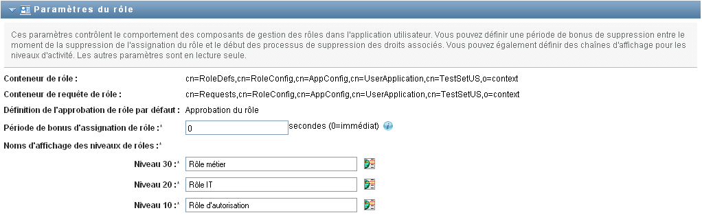 Définissez le nom d'affichage pour les niveaux de rôles. Chaque niveau possède un nom d'affichage distinct qui peut être traduit dans plusieurs langues. Pour spécifier des chaînes en langue étrangère, cliquez sur .