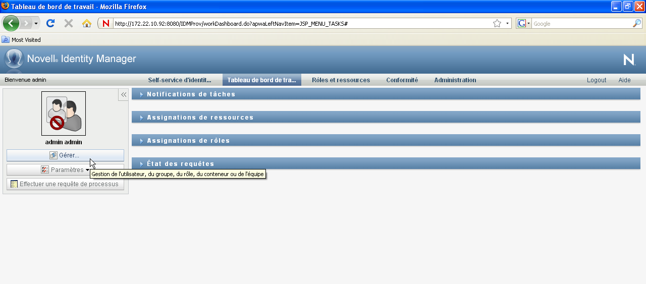 Lorsque vous sélectionnez un utilisateur, un groupe, un conteneur, un rôle ou une équipe, le tableau de bord de travail vous met en mode de gestion et met à jour la section Profil utilisateur du côté gauche de l'écran. Le profil utilisateur met à jour son écran, comme suit :