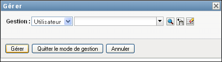 Lorsqu'un administrateur de domaine ou un gestionnaire de domaine se logue à l'application utilisateur, le tableau de bord de travail affiche le contrôle , qui est un contrôle de recherche global. Le contrôle permet à l'utilisateur actuel de sélectionner un utilisateur, groupe, conteneur, rôle ou membre de l'équipe particulier et d'utiliser l'interface de tableau de bord de travail afin de gérer le travail pour le type d'entité sélectionné. Après que l'utilisateur a sélectionné une entité, les autorisations de données et d'accès du tableau de bord de travail appartiennent à l'entité sélectionnée au lieu de l'utilisateur actuellement logué. Toutefois, lorsque l'utilisateur est en mode Gérer, les menus et s'appliquent toujours à l'utilisateur logué et non à l'entité sélectionnée dans le contrôle .