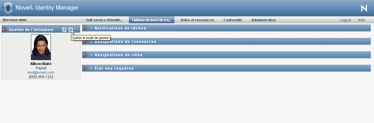 Pour quitter le mode de gestion et réinitialiser le tableau de bord de travail pour afficher les autorisations de données et d'accès de l'utilisateur actuellement logué :