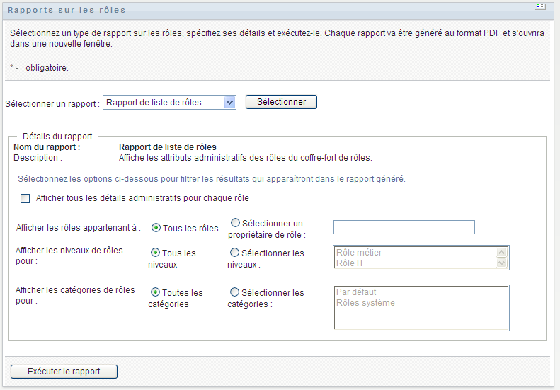 Sélectionnez dans le menu déroulant , puis cliquez sur . La page Rapports sur les rôles vous invite à sélectionner les paramètres à inclure dans le rapport.