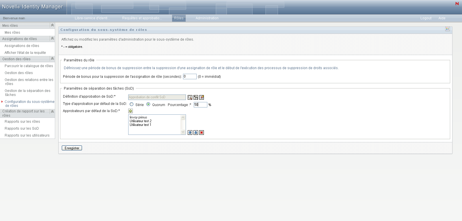 Pour définir les paramètres d'administration du sous-système de rôles :