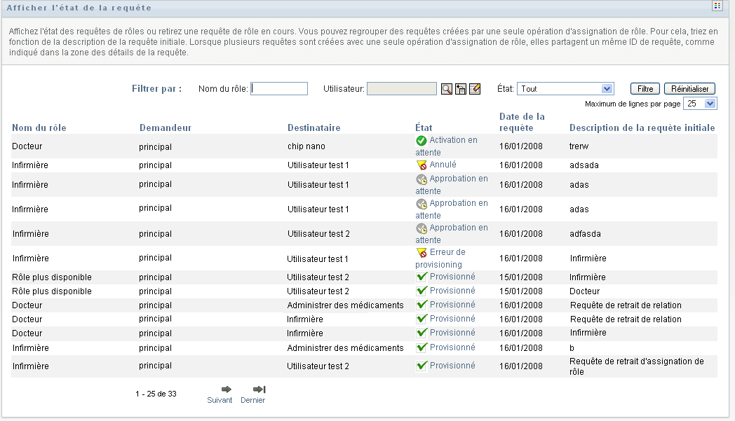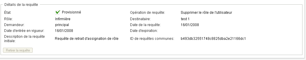 L'opération permet d'afficher l'état de vos requêtes de rôles, notamment les requêtes effectuées directement, ainsi que les requêtes d'assignation de rôle pour les groupes ou les conteneurs auxquels vous appartenez. Elle permet d'afficher l'état actuel de chaque requête. Vous pouvez en outre retirer une requête qui n'est pas finalisée si vous avez changé d'avis et si vous ne souhaitez plus qu'elle se poursuive.