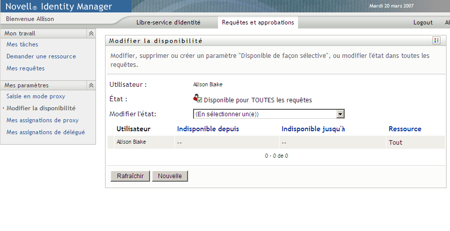 La date de fin que vous spécifiez doit se situer dans la période autorisée par l'assignation de délégué. Par exemple, si l'assignation de délégué expire le 31 octobre 2007, vous ne pouvez pas spécifier la date d'expiration date du 15 novembre 2007 pour le paramètre de disponibilité. Si vous spécifiez la date d'expiration date du 15 novembre 2007, elle est automatiquement corrigée lorsqu'elle doit expirer le 31 octobre 2007.