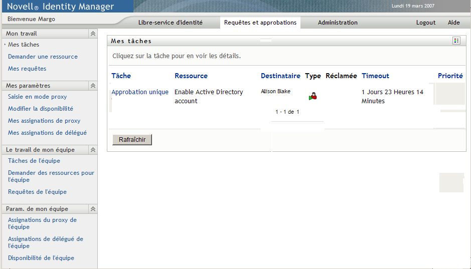 Par défaut, après vous être logué à l'interface utilisateur Identity Manager, l'onglet s'ouvre et affiche la page Mes tâches :