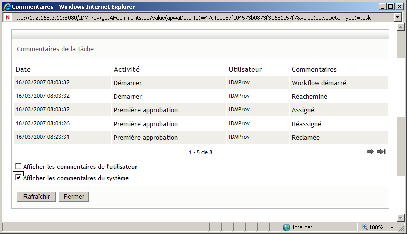 Une fenêtre contextuelle permet d'afficher les commentaires de l'utilisateur et du système. L'ordre d'apparition des commentaires est déterminé par le tampon horaire associé à chaque commentaire. Les commentaires entrés les premiers s'affichent les premiers. Pour les flux parallèles d'approbation, l'ordre des activités actuellement traitées peut être imprévisible.