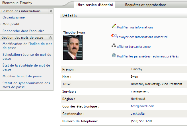 Voici un scénario montrant comment quelqu'un peut se relier aux détails d'un autre utilisateur ou d'un autre groupe. Timothy Swan (vice-président du marketing) se logue dans l'application utilisateur Identity Manager et accède à la page Mon profil :
