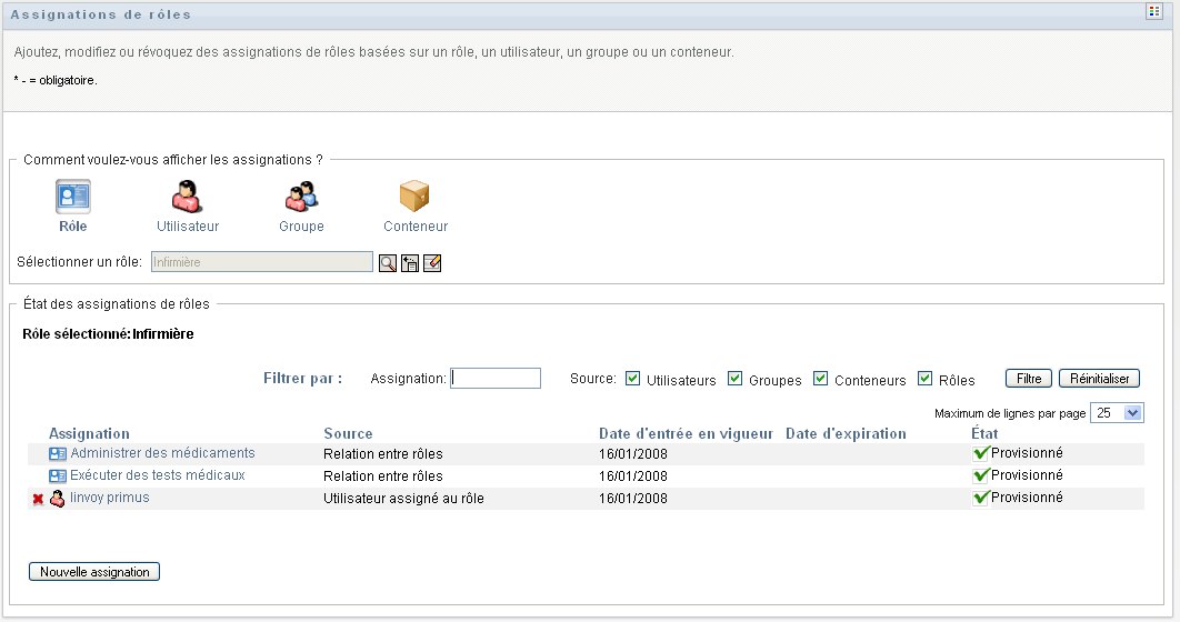 L'application utilisateur affiche l'état actuel des assignations pour le rôle sélectionné.
