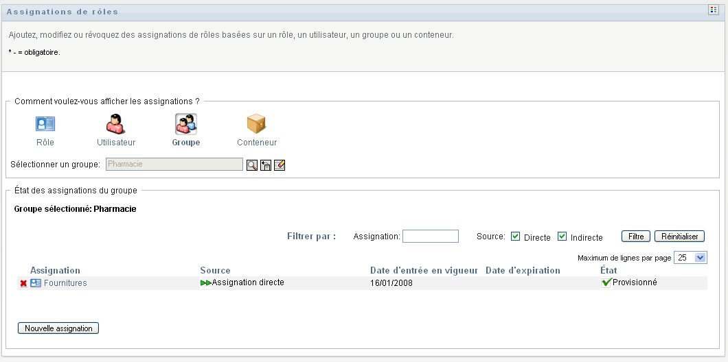 Pour afficher les assignations qui ont été assignées indirectement, cochez la case . Les assignations indirectes sont les assignations qu'obtient un groupe grâce à une relation de rôle.
