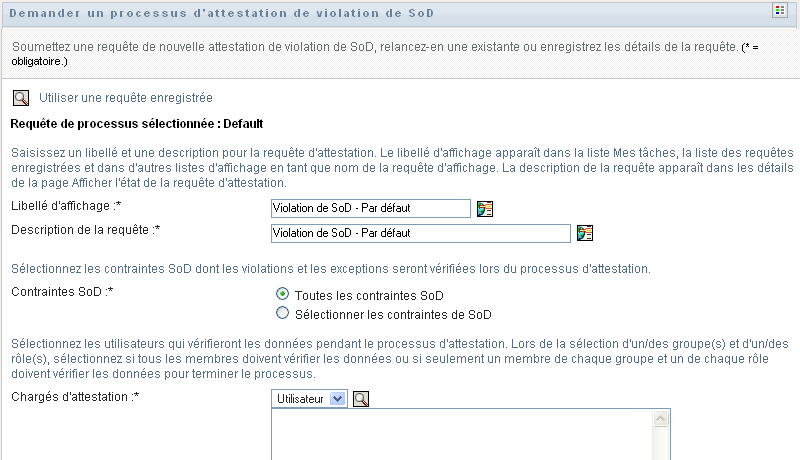 Vous devez sélectionner au moins un utilisateur, un groupe ou un rôle de chargé d'attestation avant de lancer un processus d'attestation. En revanche, il n'est pas obligatoire de sélectionner un chargé d'attestation pour enregistrer une requête.