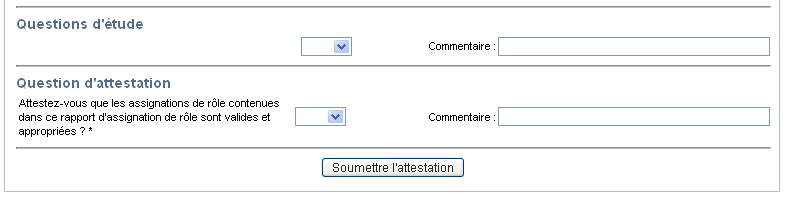 Lorsque vous réclamez une tâche associée à une requête d'attestation, vous devez valider les informations affichées dans le formulaire d'attestation. En outre, vous devez répondre à la question d'attestation requise, qui indique si vous devez attester l'exactitude des données et, dans certains cas, répondre à une ou plusieurs questions d'enquête. Pour les processus d'attestation de profil utilisateur, le formulaire comporte les données de vos attributs d'utilisateur dont vous devez vérifier l'exactitude. Pour les processus d'assignation de rôle, d'assignation d'utilisateur, et d'attestation de SoD, le formulaire comporte un rapport contenant l'assignation de rôle, l'assignation d'utilisateur ou les données de SoD que vous devez vérifier.