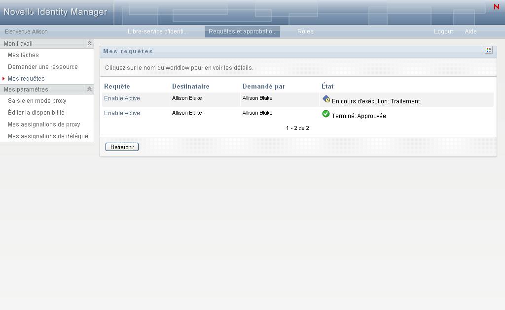 La page Demander une ressource affiche vos requêtes. Cette liste comporte les requêtes actives, ainsi que celles qui ont déjà été approuvées ou refusées. L'administrateur peut contrôler pendant combien de temps les résultats du workflow sont conservés. Par défaut, le système de workflow conserve les résultats de workflow pendant 120 jours.