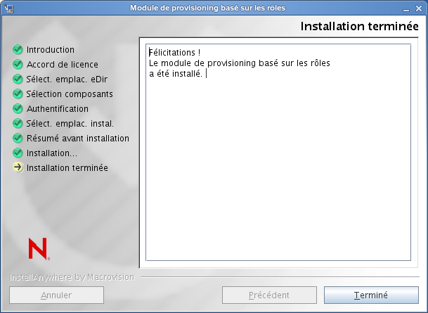 Une fois l'installation terminée, le programme d'installation affiche l'écran correspondant :