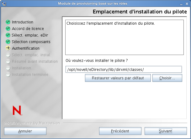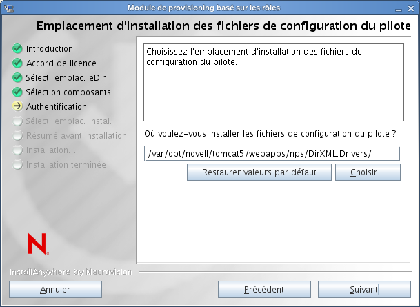 Si les références de l'utilisateur sont valides et que l'utilisateur possède les droits appropriés, le programme d'installation affiche l'écran Emplacement d'installation des fichiers de configuration du pilote :