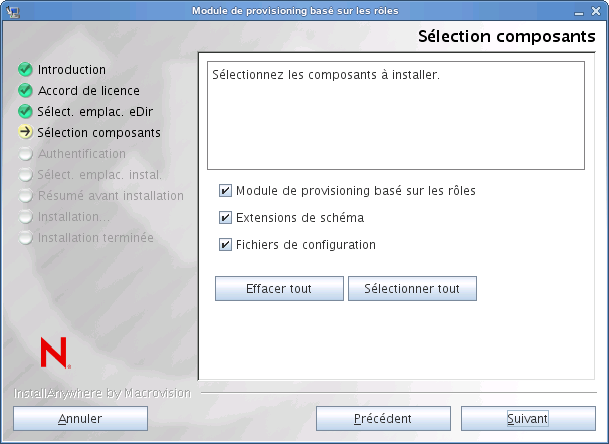 L'écran Sélection composants s'affiche et répertorie les composants du méta-annuaire requis pour l'exécution de l'application utilisateur RBPM :