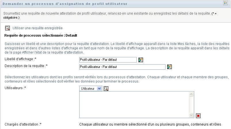 Vous devez sélectionner au moins un utilisateur, un groupe, un rôle ou un conteneur avant de lancer un processus d'attestation. En revanche, il n'est pas obligatoire de sélectionner un utilisateur, un groupe, un rôle ou un conteneur pour enregistrer une requête.